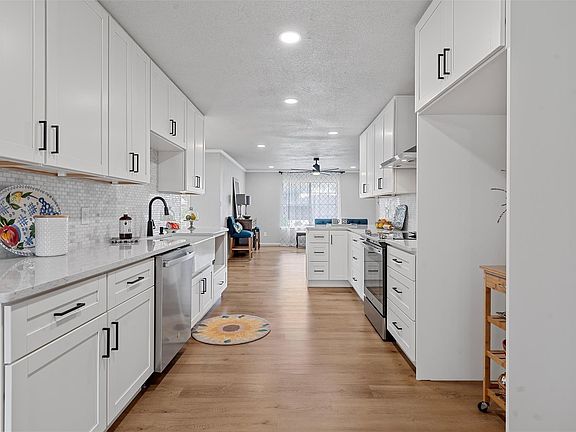 Formal dining roomStainless steel appliancesNew cabinetsLight bright and comfortableLarge kitchenAmple storage throughoutOffice with closet