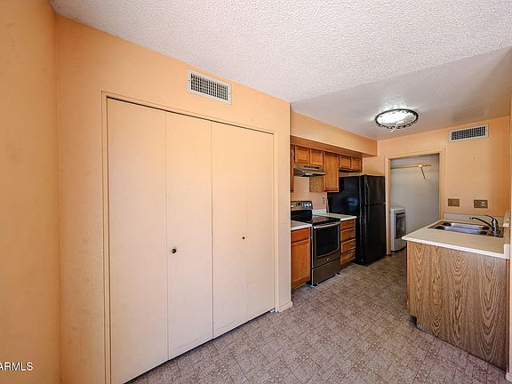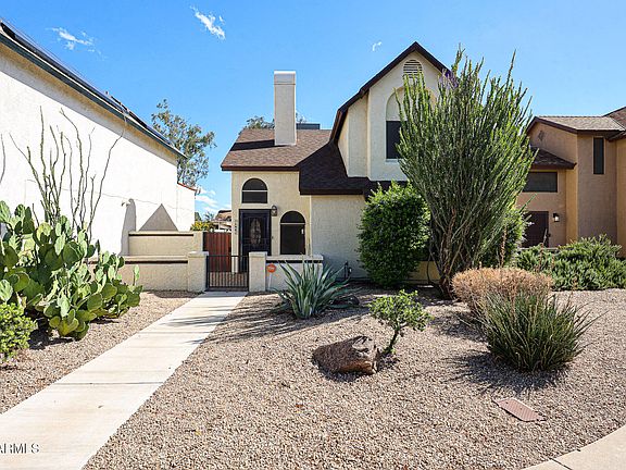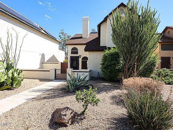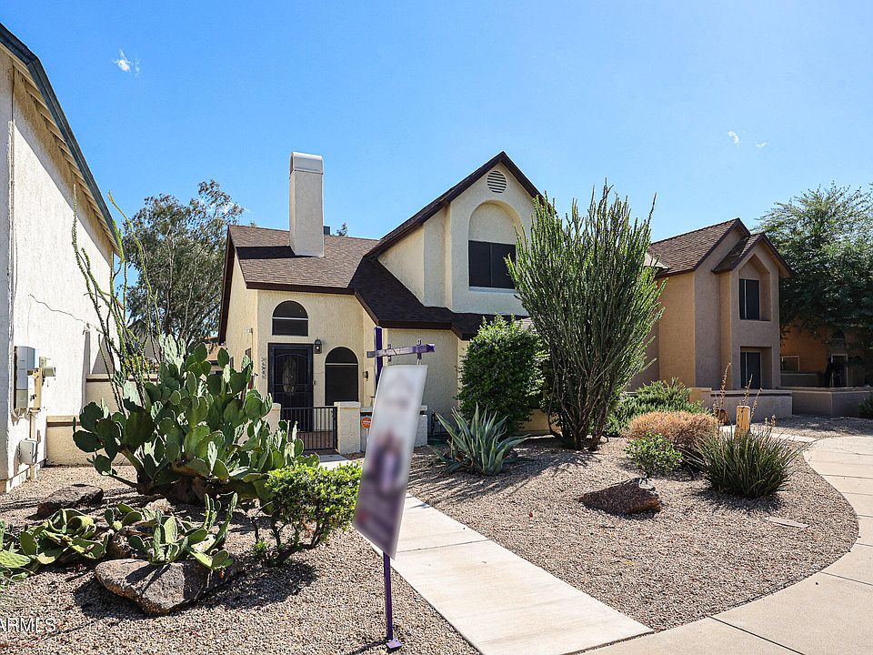 This charming home offers incredible potential for someone ready to make it their own! Featuring soaring vaulted ceilings, a cozy fireplace, and tons of natural light, this layout has great bones and plenty of space to personalize. The kitchen includes a full appliance package with a nearby laundry area, and the upstairs bedrooms provide privacy and comfort. Enjoy a low-maintenance backyard with brick pavers, desert landscaping, and alley access to covered parking. Being sold as is, this home is the perfect canvas to create your dream space!