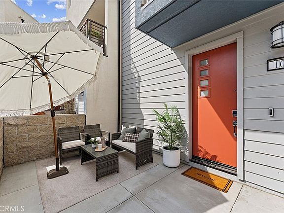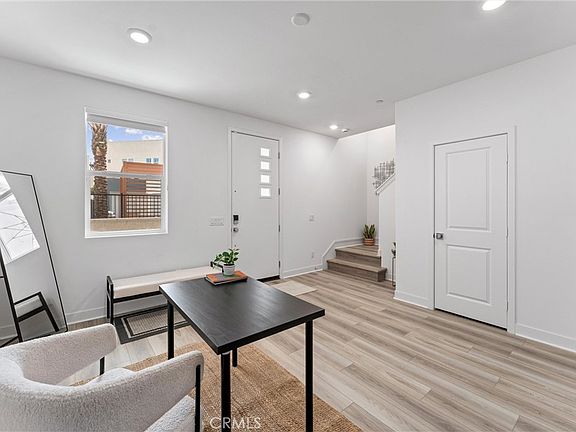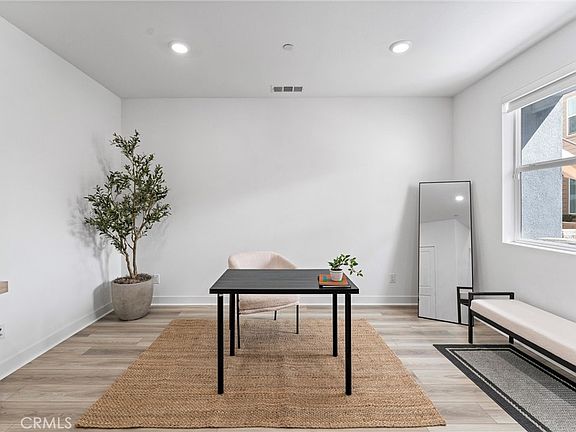 Discover modern living at its finest in this immaculate 3-bedroom, 2.5-bathroom tri-level townhome, located in the gated community of Emerald Pointe by Lennar. This nearly new residence, with 1,799 sqft of thoughtfully designed space, combines contemporary style with everyday comfort. As you enter, you're welcomed by a spacious bonus area on the first floor—ideal for a home office, media room, or playroom. The main level opens up to a light-filled living area with upgraded luxury vinyl flooring, setting the stage for effortless entertaining or relaxing. The chef’s kitchen is truly the heart of this home, featuring quartz countertops, a large island, stainless steel appliances, and ample cabinetry with soft-close features. The pantry closet ensures you'll never run out of storage space. Upstairs, natural light pours into all three bedrooms, including a serene primary suite with a walk-in closet and an ensuite bath. Two additional bedrooms and a full bath complete the top floor. With a paid-off solar system, energy efficiency is yours to enjoy. The home boasts a two-car, side-by-side garage equipped with level two EV charging, catering to your modern needs. Outside, the private balcony offers a picturesque resort-like view of the community pool, perfect for unwinding after a long day. Located just minutes from the 5 freeway, this home is ideally situated near popular dining spots, shopping, and the magic of Disneyland, making it as convenient as it is charming. Don’t miss the opportunity to own this pristine, move-in-ready townhome.