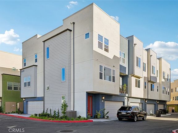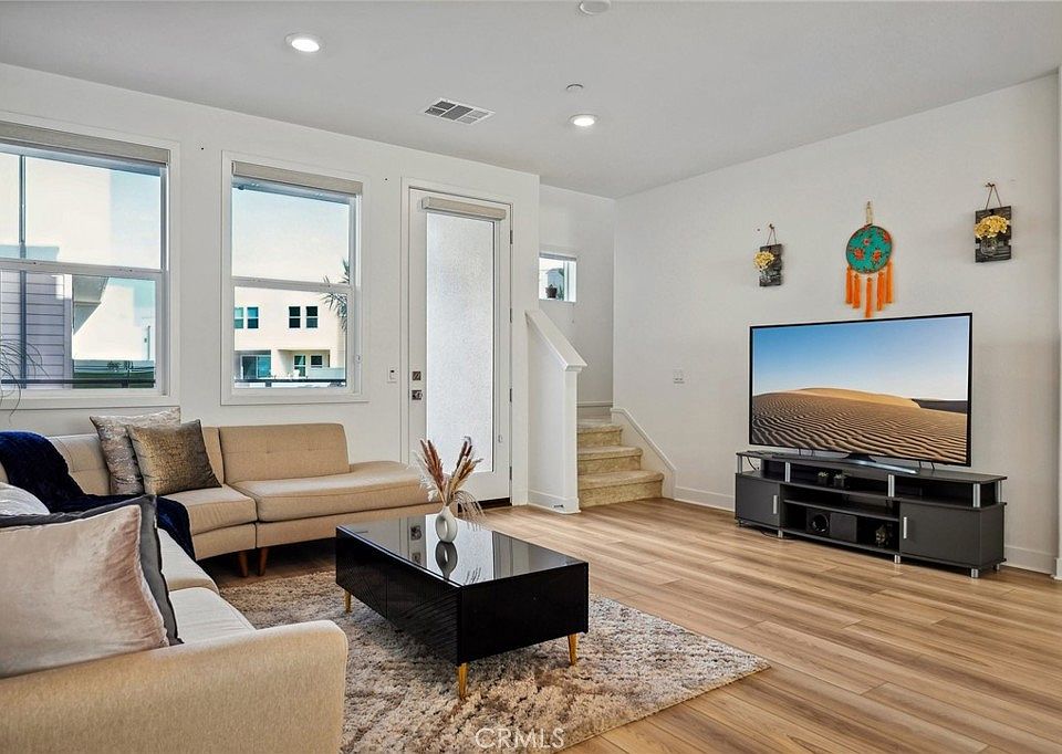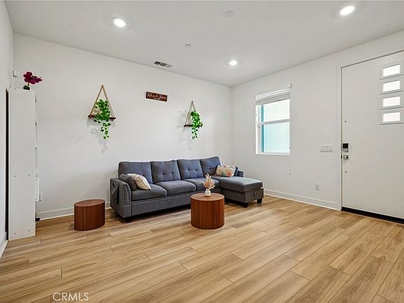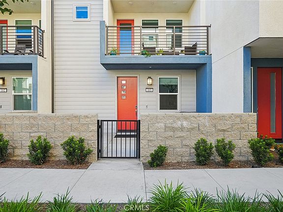 Imagine living in the desirable gated community of “Emerald Pointe” with upgrades already completed and included: PAID SOLAR, WOOD FLOORING, CLEAN WHITE BRIGHT TONES, HIGH-END APPLICANCE and more. This spacious entry features recessed lighting, blinds and a closet perfect for a den, home office or play area. Up the stairs to the great room with large windows that allow an abundance of natural lighting to illuminate the open concept floor plan. The kitchen impresses with Quartz countertops, clean white soft closing cabinetry and drawers, pantry, built-in buffet with plenty of storage and a farm-style sink. The new Stainless-Steel Energy Star appliances include a five-burner gas range, single oven microwave, dishwasher and refrigerator. A center island breakfast bar with high stool seating and adjacent dining area opens to the living room with high ceilings, step out onto the balcony that overlooks the pool area. The half bath completes the second floor. Up the carpeted stairs to the primary ensuite with blinds, walk in closet, dual sink vanity with Quartz countertop and a step-in glass enclosed shower. The generous size secondary rooms feature carpet, blinds and closets. Down the hallway is a full bathroom with a single sink vanity with Quartz countertops and tub in shower. The linen closet and laundry area include stackable washer and dryer for your convenience. 2-car garage with direct access inside access, plenty of guest parking, A/C unit, tankless water heater and dual pane windows. Enjoy the community amenities with sparkling pool, fire pit, two dog parks, BBQ area and picnic area. Nearby Downtown Metro area and Anaheim Packing District, restaurants, coffee shops, shopping, parks and easy access to the 5, 91 and 22 Freeways. NOTE: multiple upgrades already including in this 1-year old home with SOLAR PAID.