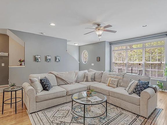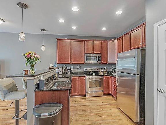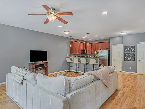 Open concept main levelEnd-unit townhomeLvp floorsCustom built-in shelvesBreakfast barLarge new double-door fridgeMaple cabinets
