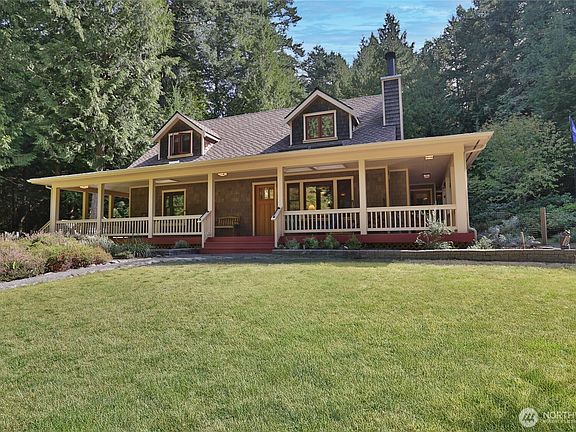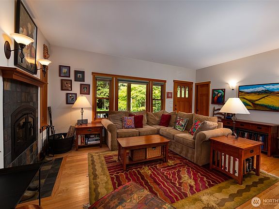 Privately tucked behind a long driveway, this 2,350 sqft craftsman style home sits on nearly five forested acres. The main level offers spacious living with two wood burning fireplaces, a large wrap around porch, a patio by a tranquil pond and outdoor sauna. The primary suite includes a generous bath with separate tub & shower, plus a walk in closet & attached office or nursery. An oversized one car garage with workshop space and a heated upstairs game room adds flexibility. The property also includes two storage sheds, two wood sheds, a children's play area and a large flat lawn ideal for sports. With partial fencing, irrigation, a 22,000 gallon catchment system, and a generator, this retreat blends comfort, privacy and practicality.