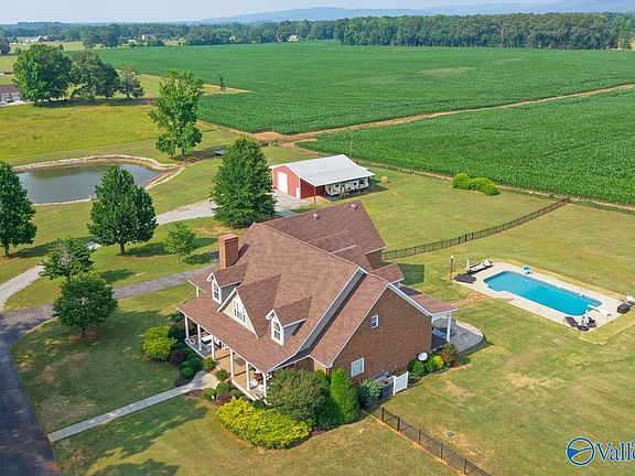 Gorgeous home situated on 8 acres w/ inground pool, pond, storm shelter, & 44x28 detached workshop w/ boat/RV storage! Fabulous floor plan w/ isolated primary suite w/ glamour bath, custom shelving & access to the covered back porch! The kitchen is a chefs dream w/ 6 burner cooktop, double ovens, breakfast bar, & butcher block island. Elegant formal dining room right off the kitchen w/ built-ins perfect for holiday gatherings. Study great for home office. Great room w/ stacked stone fireplace, recessed lighting & built-ins. 2nd floor has 4 beds, 3 full baths, office, bonus, & rec room/home gym. Just 25 minutes to Redstone Arsenal, less than 2 miles to Buckhorn High! Can be sub-divided!