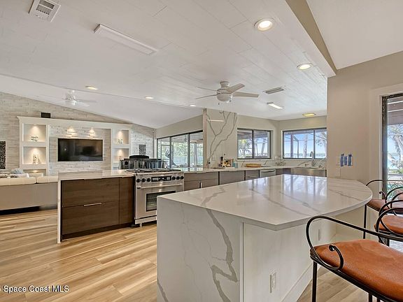Luxurious Waterfront Island Home Step into paradise with this fully furnished, single-level, waterfront, luxury, island home. Nestled on over an acre of private beach along the deep Intracoastal Waterway, this 5-bedroom gem offers breathtaking sunsets and abundant wildlife. Additionally, the property includes a studio apartment, perfect for multigenerational living. 3 Car Garage! Conveniently located just 45 minutes from Orlando, 30 minutes to Kennedy Space Center, and 8 minutes to pristine beaches. Enjoy direct waterfront views from most rooms and access to the pool. The primary bathroom features Turkish marble floors, a Jacuzzi tub, and a three-head waterfall shower system. Entertain in style with a spacious great room, complete with a Baldwin baby grand piano and stunning waterfront views. The newly designed gourmet kitchen seats eight and offers panoramic views and pool access. Dine with elegance as another eight-seat dining table also shares these views. Work comfortably in a separate office with two dedicated workspaces, equipped with a full bed and single trundle. Amenities include double washer/dryers, beach gear, yard games, kayaks, paddle boards, putting green and ample parking. Relax around the fire pit or enjoy the outdoor sectional couch by the sparkling pool with a large-screen TV. High-speed Wi-Fi and outdoor showers add to the convenience. Wheelchair accessible with no stairs, this home is ideal for all. Don't miss out on the chance to lease this luxurious island retreat! Also, the owner has a boat available for day-to-day lease at a separate price. Contact us today for a private tour! Owner is a licensed Realtor.
