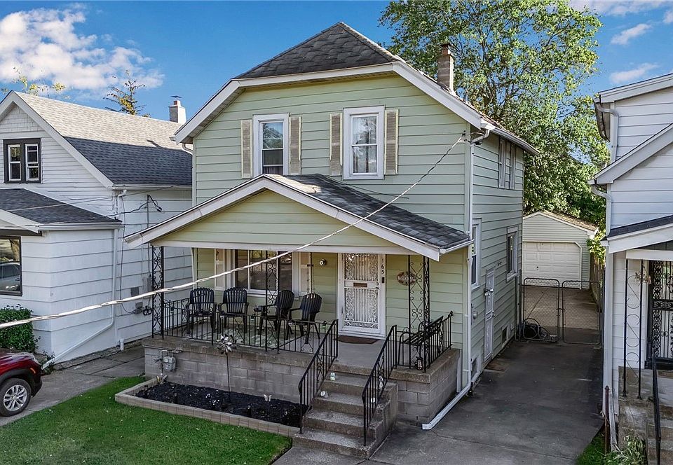 Three-bedroom colonial with a large front open porch, spacious living room and dining room combination, updated eat-in kitchen with white cabinets! Some replacement windows, updated breaker box, concrete driveway leading to a new one and a half car garage!