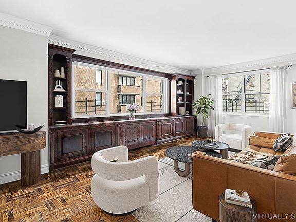 The expansive corner living room, with elegant built-ins, is perfect for entertaining or relaxing. The large primary bedroom, also boasting dual exposures, provides comfort and serenity and can easily accommodate a king-sized bed, desk, dresser and Peloton. A versatile alcove can easily serve as a dining room, second bedroom, nursery, or home office/den to suit your needs.