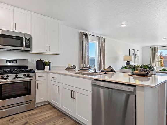 Single level homeAdjoining dining areaShower and soaking tubQuartz countertopsPlenty of cupboard storageSizable bedroomsCover front porch
