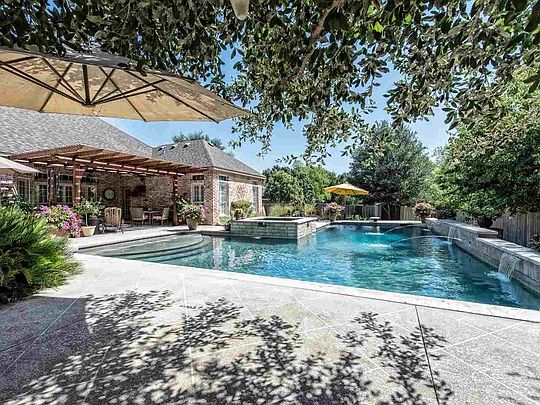 Beautiful family home w/in ground pool & spa on tree cov., private lot. Was parade home when new. Form. areas + fam. room w/blt ins- is open to kitchen & breakfast room. Gourmet kit. w/over sized island, glass frt cabinets, granite, tile back splashes. 984 sq. ft. upstairs includes game room, full bth, and room that could be bedroom. Mstr suite features double walk in shower, sep. spa tub, his & her vanities, lrg walk in closet. Back yd paradise- gunite pool.