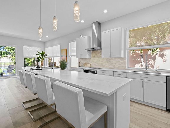 Nestled in the highly sought-after Hamptons of Jupiter, this DiVosta-built lakefront home has been meticulously renovated to offer modern luxury and effortless living. From the moment you step inside, the light and airy design creates an inviting atmosphere, perfect for entertaining. The stunning kitchen is a chef's dream, featuring an oversized quartz island, a kitchen nook ideal for a coffee bar or bistro set, and high-end finishes that seamlessly blend style and functionality. It includes a brand-new LG refrigerator and newer KitchenAid appliances, including an induction cooktop. The kitchen is further enhanced with soft-close drawers in all cabinets, providing a sleek and modern touch. Thoughtfully designed custom window treatments, plantation shutters, and LED lighting enhance the space, while wood-like luxury vinyl flooring flows throughout the entire home, adding warmth and durability.
