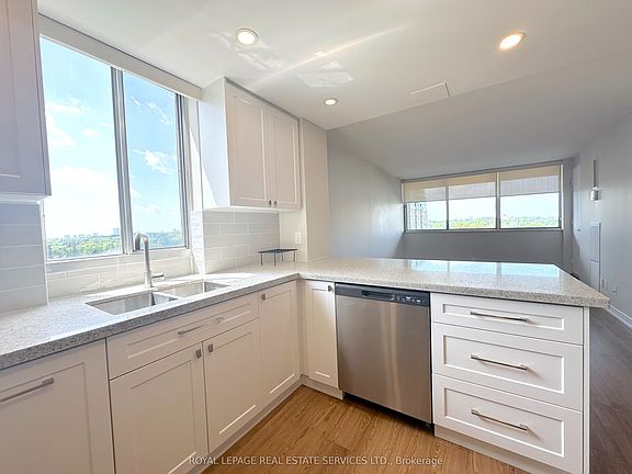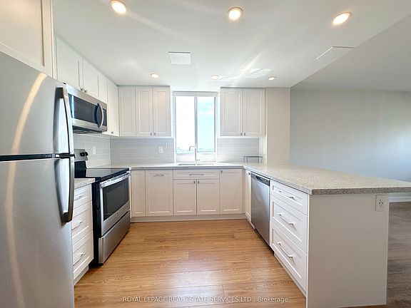 Bright and spacious 2-bedroom corner suite featuring an updated kitchen with a window, stainless steel appliances, stone countertops, and ample cabinetry. The sun-filled living area boasts wall-to-wall windows and a walkout to a large balcony with unobstructed west-facing views. Enjoy a dedicated dining area with a ceiling fan, conveniently located next to the kitchen. The generous primary bedroom includes a large walk-in closet, while the second bedroom offers plenty of space and versatility. A large in-suite storage room provides excellent space for all your extras. Located in a pet-friendly building with great amenities: fitness centre, outdoor pool, sauna, tennis courts, and a social room. Situated near Highways 401, 407, and 427, with easy access to charming European bakeries, delis, and the scenic Humber Valley Parklands' trails. Parking available to rent. Tenant to pay hydro and water.