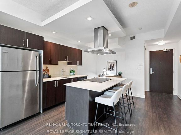 Welcome to the sought-after Legion Rd Condos, where stylish waterfront living meets unmatched convenience. This beautifully updated 1-bedroom + den suite is an entertainer's dream, featuring a sunny south exposure and an enormous 546 sq. ft. private terrace-perfect for soaking up the sun while enjoying stunning lake and ravine views.Inside, the home shines with thoughtful upgrades throughout, including freshly painted walls, ceilings, and baseboards (2025) and a brand-new washer and dryer (2024, with warranty). The modern, open-concept kitchen is equipped with a centre island, quartz countertops, stainless steel appliances, and a sleek stainless steel range hood. The versatile den easily functions as a dining nook or an ideal work-from-home office.The generous layout features 9-ft ceilings, upgraded lighting with dimmers (2025), and wide-plank laminate flooring. Enjoy walk-out access to your terrace from both the living room and the bedroom, along with ample storage in the primary and entry closets.Live the resort lifestyle with 5-star amenities, including indoor & outdoor pools and whirlpools, two fully equipped gyms (31st & 4th floors), rooftop party room and terrace with panoramic lake and city views, a landscaped rooftop garden, sauna, squash courts, yoga & aerobics studio, running track, and BBQ areas.Perfectly located-steps to the Mimico GO Station, TTC, the waterfront, Martin Goodman Trail (run/walk/bike/blade), restaurants, groceries, farmers markets, and more. Just 15 minutes to downtown.Experience vibrant, active lakeside living at its best.