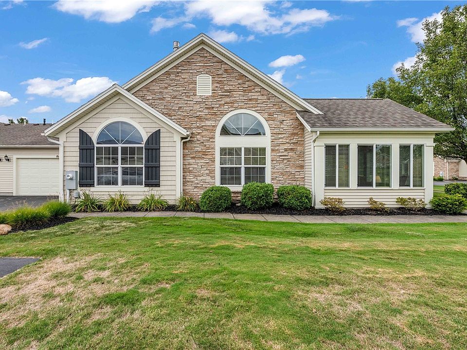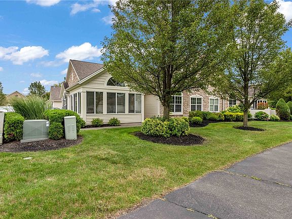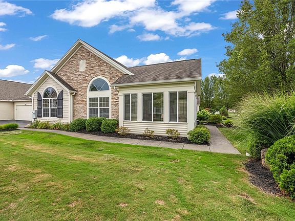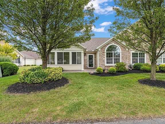 PAST DELAYED! SHOW AND SELL!**Light and bright corner unit with a view of the pond. Walk right out of the front door to the walking path and pond! Over 1800 sq ft, 2 bedroom, 2 baths with an office that could be a 3rd bedroom, light filled sunroom off fireplaced living/dining room. Kitchen is open to living area with ample cabinetry and able to accommodate a wheelchair. Lots of storage available and pull down stairs to garage loft. All appliances included, on demand hot water heater and a huge 2 car garage. Amenities include pool, exercise room and beautiful clubhouse. Quick occupancy possible. There is room for a 10x12 patio for this unit. Variance required but not a problem! Come and see this wonderful property!