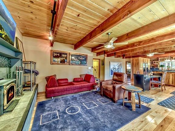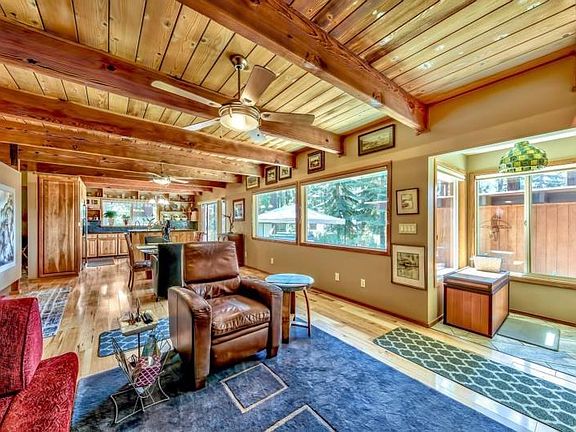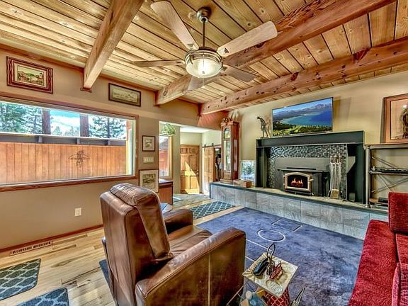 This immaculate, one level 4 bedroom, 3 bath home, located on a double lot in Lower Kingsbury is remodeled with custom finishes throughout with the upmost attention to detail everywhere. The beautiful kitchen has a GE Profile gas double oven, Fisher Paykel 2 drawer dishwasher, Jenn-Air refrigerator, built-in, self opening and closing microwave, extra deep pull-out drawers, instant hot water, built-in trash bin, leatherette granite counters, birch cabinets, "oceanside' tile, & hickory flooring throughout. The entire ceiling features beautiful open wood ceilings throughout. The living room has a wood stove, with "oceanside' tile hearth surrounded by a steel mantle w/ iron flume. There are two en-suites. The spacious, main master suite has a "Tempurpedic" King Bed, four ceiling fans, an ADA approved bathroom, huge walk in glass blocked shower, Duvet' toilet, self closing mirrored medicine cabinets, laundry room with an Aprilaire Humidifier, instant hot water & air purifier. The AWESOME "junior" suite features another "Tempurpedic" king bed w/ drawers underneath, cedar lined closet, built-in cabinets, and a beautiful bath, which includes a huge steam shower w/ a rainforest shower head, & two additional shower heads, & moveable bench to lay down on; heated towel rack, & medicine cabinet mirror. Other features include an Italian tiled marble entry/foyer, side pocket doors & two directional Honeycomb blinds throughout, ceiling fans in every bedroom, built-in drawers and cabinets in all three guest bedrooms & even air conditioning! The one car garage is insulated & heated, has 220, a wine cooler, refrigerator & a large safe that is bolted to the floor. The custom, double entry, antique Mahogany door to the main house & patio area was imported from Argentina. Once inside the private patio area you will find a putting green, a Bullfrog Hot tub & portable patio cover, along with wrought iron fencing along the front and side yards. The huge back yard is completely fenced, has a 12x12 storage shed, extra wood, and even a tree house! The automatic sprinkler system works the landscaped front & patio area. Even the BMPS's are done! Located on a .43 acre double lot w/ USFS lot directly behind the home. With a small peak of the lake from the driveway, and located within minutes of Heavenly Valley & all the Casino action, this delightful home is located in one of the most convenient locations one could ask for. Being sold partially furnished, less personal items, some antiques & artwork. Inventory list to follow. Sale includes 163 Meadow Lane, which is an unbuildable lot to the south.
