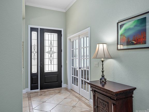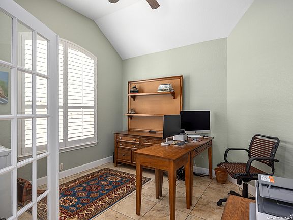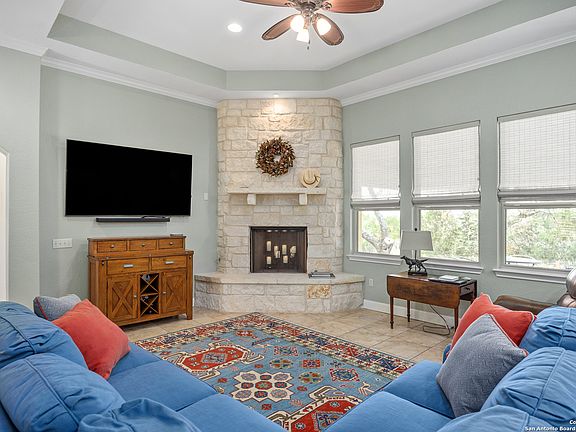 Nestled among majestic mature oak trees, this Hill Country classic exudes timeless elegance with stone and stucco exterior & standing seam roof. An exceptional residence, where charm and sophistication meet modern comfort. Exquisite leaded glass front door leads into an open-concept living space, where a stepped-up ceiling, corner fireplace, & expansive windows create a light-filled atmosphere. Large ceramic tile floors seamlessly connects each thoughtfully designed area. The gourmet kitchen is a chef's dream, featuring gleaming granite countertops, a striking stone-accented island with a breakfast bar, & custom Alder cabinets. Stainless steel appliances elevate the space, with adjacent breakfast nook providing a cozy spot to start the day. The formal dining area captivates with a stained beadboard ceiling & an elegant chandelier. Double French doors lead to a private study. The primary suite offers a stepped-up ceiling & an ensuite bath adorned w/granite & custom cabinetry. Two guest bedrooms w/adjoining bath. Large covered porch overlooks the backyard. A fenced dog yard ensures a space for pets & storage shed adds convenience. A perfect blend of Hill Country charm & luxury!