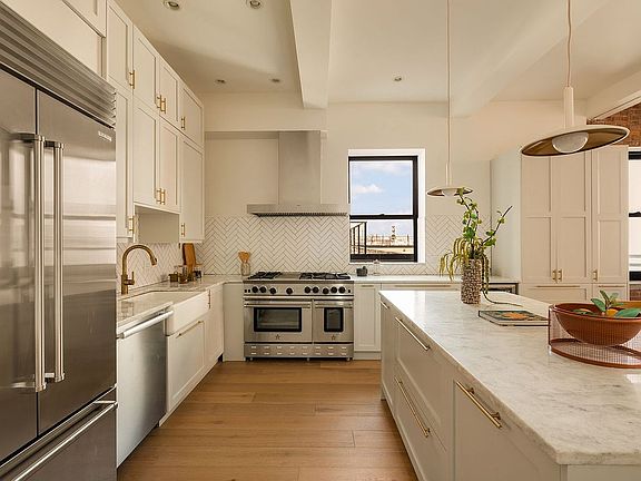 The expansive living room, framed by exposed brick and multiple exposures, creates a bright, airy ambiance with its open chef’s kitchen. Outfitted with stone counters, custom cabinetry, a Sub-Zero refrigerator, Miele dishwasher, wine cooler, and a BlueStar range with a vented hood, this chef’s kitchen is a dream and anchors the great room.