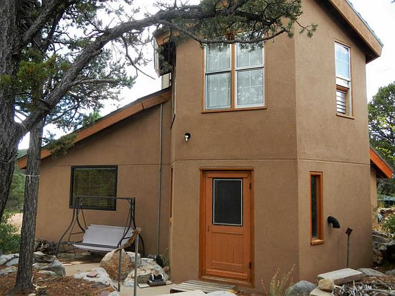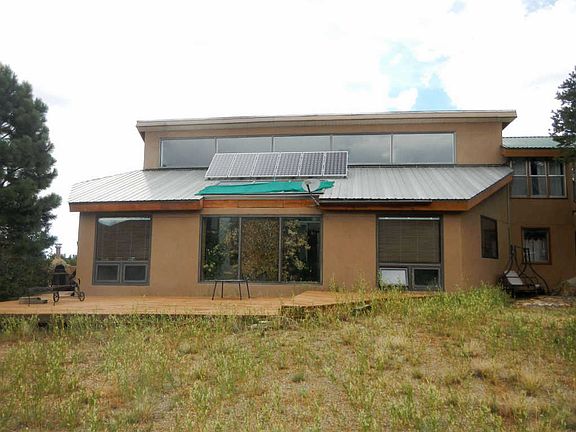 Imagine, unbelievable mountain vistas, green ponderosa pine, incredibly crisp fresh air, and pollution free night skies, so dark you can capture the heavens! No, this is not a dream, it is found at 165 Ranchitos. Located between Albuquerque and Santa Fe, hidden at the end of the road, on over 40 acres of tree covered privacy. Features include: south facing and light filled, off grid and solar powered with new battery backup, solid/thick concrete filled foam walls, 2 bedrooms, 2 baths, attached greenhouse, wrap around deck, and outdoor kiva. Plus a detached large garage with workshop/studio. Wood stove for heating, propane and backup generator, private well.