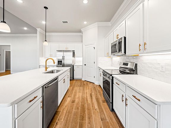 - Breakfast Bar, Crown Molding, Kitchen Island, Recessed Lighting, Pantry, Shelving, Split Bedroom, Bedroom, Dining Room, Full Bathroom, Kitchen, Living Room, Master Bathroom, Master Bedroom