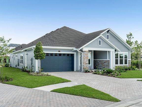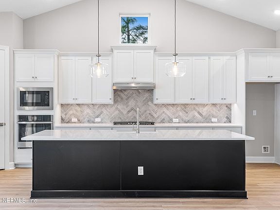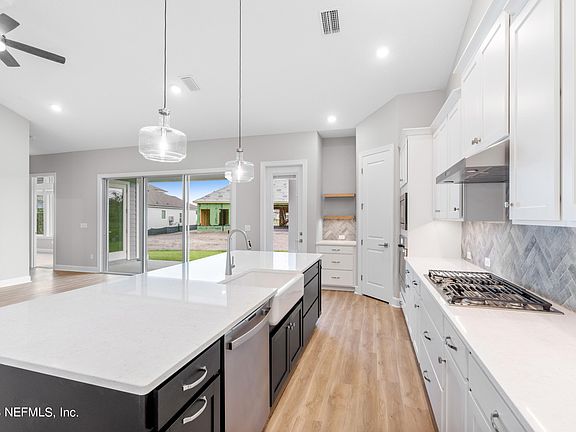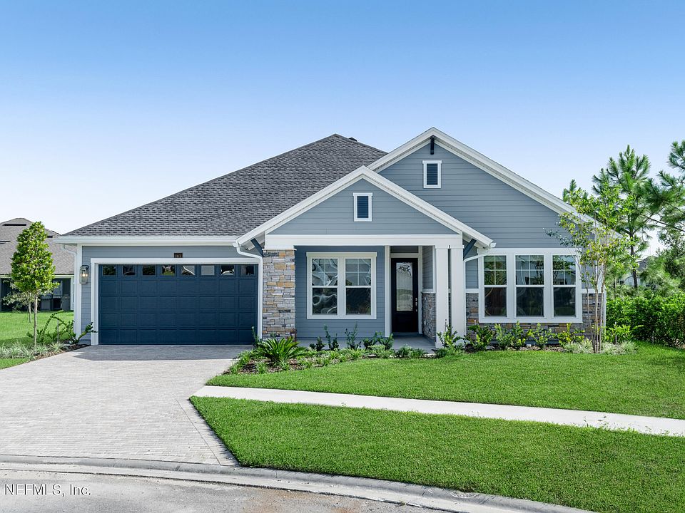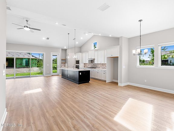 The Julington adds sophistication to the streamlined versatility that makes this luxury home plan ideal for families whose lifestyle needs will change through the years. The open-concept living spaces provide a picture-perfect setting for social gatherings and cherished everyday moments with those you love. An abundance of windows and the sliding glass door pour natural light into the gathering space to highlight the vaulted ceiling complete with decorative beams. The gourmet kitchen features wrap-around counters, a gorgeous quartz presentation island with built-in stainless steel appliances where birthday cakes, family dinners, and shared memories of holiday meal prep all begin.