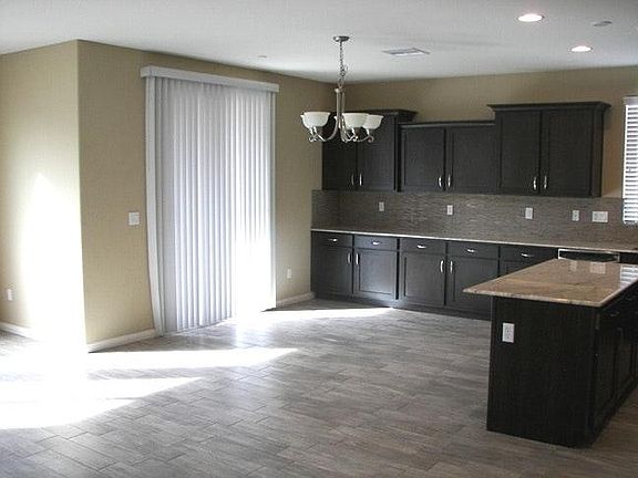 Paver stone drivewayDark wood cabinetryFull appliancesLarge center islandTiled floorsCeiling fansGranite countertops