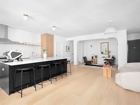The result of a seamless combination of 3 apartments, 6ABC is a rare offering boasting a spacious 1700+/- square feet. Interiors are pin-drop quiet and finely appointed, marked by gorgeous wood flooring, tasteful arches and moldings, and oversized windows inviting in lovely light from southern, northern, eastern and western exposures. As the residence top floor, the living room and primary bedroom enjoy airy 10-foot ceilings, while the remainder of the rooms have 9-foot ceiling heights.