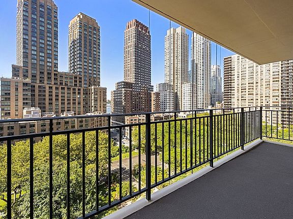 Perched on the 10th floor of 165 West End Avenue, the apartment offers sweeping Hudson River views as well as tranquil vistas of Lincoln Towers" private gardens and lush treetops. A private balcony of over 19 feet extends your living space outdoors-an idyllic retreat for morning coffee, alfresco dining, or enjoying dramatic sunsets.