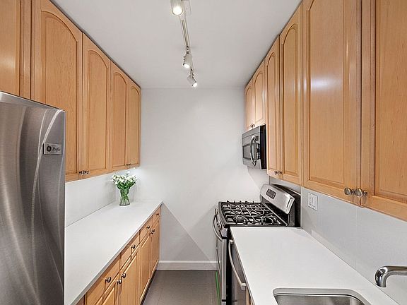 The entire home has been lovingly renovated including skim-coated walls and white oak floors throughout. The sleek kitchen has Caesarstone counter tops, under mount lights, an abundance of cabinet space and stainless steel appliances by GE and Bosch. The renovated bathroom features slate tiles and Duravit sink and vanity. Five generously sized closets, outfitted with custom built-ins, provide more storage than you will find in other one-bedroom units. The large bedroom also faces East for beautiful morning to mid-day direct light and reflective sunlight in the afternoon.