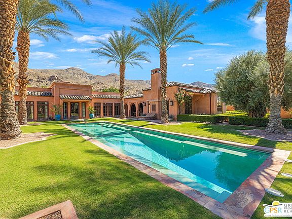 A cinematic interplay of architecture, landscape, and light defines this South Palm Springs estate that reimagines modern desert luxury. Nestled in the exclusive Andreas Hills enclave, the residence offers a rare harmony of artistry, comfort, and absolute privacy. Originally envisioned by the acclaimed firm Tichenor & Thorp, this Moorish-inspired masterpiece has been thoughtfully reimagined for contemporary living. Spanning nearly one third of an acre, the estate features 5 bedrooms, 5.5 baths, and over 4,800 square feet of refined living space including a private guest house and exceptional bedroom separation for privacy and flow. Every detail reflects the designers' celebrated eye for form, proportion, and garden composition. Grand scale meets serene restraint with high ceilings, tall Venetian plaster walls, and graceful arched passageways that frame curated views of courtyards and lush gardens. Carrara marble surfaces, broad skylights, and French doors bring balance and light, while the formal living room's commanding fireplace provides a striking architectural centerpiece. The chef's kitchen is both functional and inviting, blending custom cabinetry, an oversized marble island, and generous workspace that opens seamlessly to the family room. Designed for connection, it accommodates everything from morning coffee to large scale entertaining with effortless sophistication. Outdoors, the home's series of covered and open air patios dissolve boundaries between structure and nature. A fireplace warmed loggia, alfresco dining area, and intimate garden vignettes encourage lingering under the desert sky. Mature 100 year old olive trees, towering date palms, and lush layered plantings form a tranquil backdrop to the dramatic pool and secluded spa, enhanced by outdoor showers and complete privacy. With owned solar, a gated motor court, and every modern refinement, this Andreas Hills estate is both a timeless architectural statement and a deeply livable sanctuary, a rare composition of light, texture, and soul.