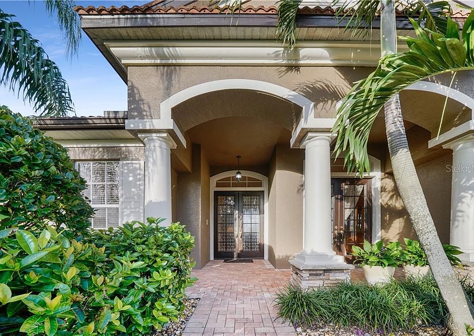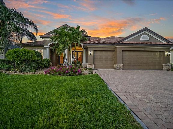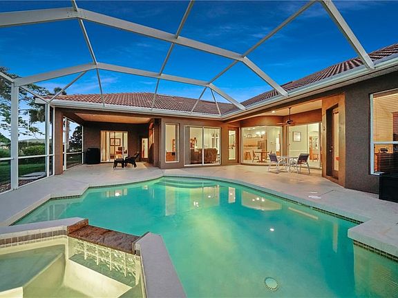 Looking for an elegant estate home with entertaining and privacy in mind? Your guests will be envious of this meticulously maintained home! Its custom design is meant to accommodate your entertaining needs while appreciating the beauty and privacy this home offers. Foyer entry, tray ceilings, crown molding. A spectacular 8ftx8ft aquarium bay window accentuates the special view of the pool, spa and golf course landscape. Full sliders expand your living space allowing access from the living room to the spacious 32x30 screened lanai, pool and waterfall heated spa, with additional 10x12 outside dinette area AND additional 10x16 undercover seating area thats all set up to install your outdoor kitchen. You will love the spacious master suite with crown molding, separate en-suite bath, double sink vanities, garden soaking tub, walk-in shower, private access to the lanai and pool/spa. The open well-equipped kitchen with plenty of cabinet space and a breakfast bar, has wood cabinets, stainless appliances, solid surface counter tops, walk in pantry closet, and built-in desk. The dinette area with aquarium dining windows has a view to the pool and golf course. Spacious formal dining room with garden French doors. This home would work well if you desire two master suites as bedroom 2 has easy access to its own full bath with walk-in shower. The split design has the guest bedrooms on the other side of the home and are private with easy access to the additional 2 separate guest bathrooms. A full-size laundry room with cupboards, utility sink. The yard is beautifully landscaped including irrigation system. The large 3 stall garage is 27ft deep x 22. Oversize brick paver driveway & garden entrance walkway. This home awaits your quiet romantic evenings. This active golf community boasts ample amenities with a clubhouse, onsite restaurant, community pool, fitness center, and inviting activity schedule. Centrally located with activities, beaches, baseball spring training & all the area's amenities.