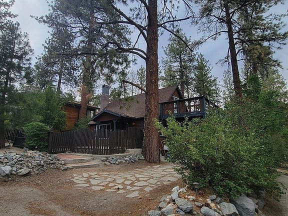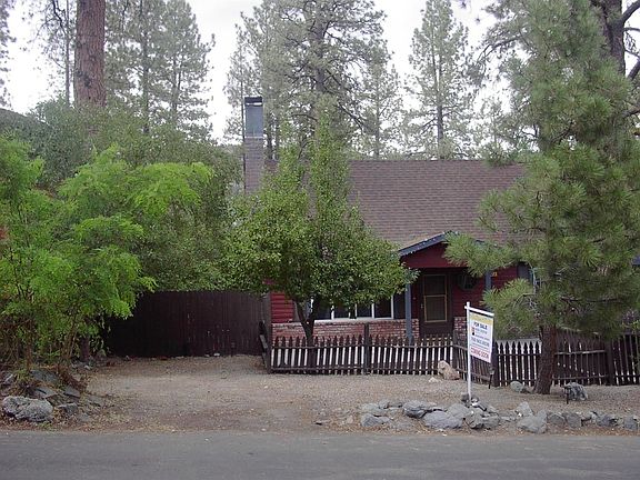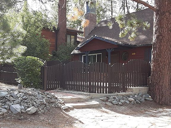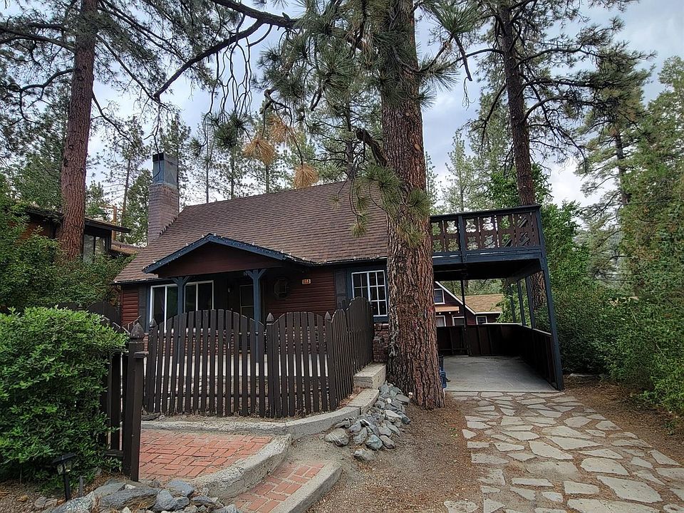 Set back from the road framed in tall pines home has two bedrooms and two bonus rooms that may be used as third and fourth bedrooms, two bathrooms, separate living and formal dining rooms, and an Alpine Swiss Chalet bungalow architectural style. A one-and-a-half storey home or future bed & breakfast features side yard and patio accessible from the living room. The private entrance in the side yard leads to the newer second bath and indoor laundry. Living room features gas fireplace, hearth, picture window, entry to kitchen, and a slide-out door to stairs to two more rooms, storage areas, and balcony. Home has a second concrete patio in the front yard. Off the kitchen is a dining room with sliding glass doors that opens to a mini-deck and large backyard. Two-hundred sixty four square foot carport plus spaces to park at both sides of the home provides off road parking. Per seller electrical upgrade, septic tank approx. fifteen months new, newer water heater, and washer and dryer can be included in sale.