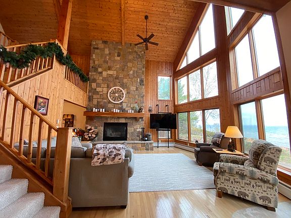 This spectacular custom-built home is situated on 200' of the finest stretch of Lake Superior's Whitefish Bay. This is America's North Coast! Strong vacation rental history; revenue info will be provided to pre-qualified buyers only. The home features three levels with multiple living areas. Two bedrooms on the ground floor and two bedrooms on the main level. Three full bathrooms in total. Custom millwork and cabinetry throughout, stainless appliances and granite countertops. This home is meticulously maintained. It is set up for entertaining and can accommodate groups up to 10. New roof. 2-car attached garage with cement approach. Huge new pole barn (42 x32) with a 16x32 covered carport to park your motorhome or boat. Showings require pre-qualification/proof of funds.