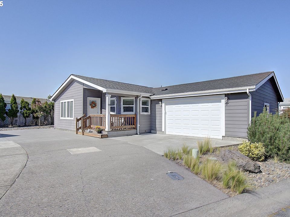 Light, Bright & Move-In Ready!This beautifully maintained home welcomes you with soaring vaulted ceilings and an open-concept living space designed for natural light. Oversized south-facing windows flood the living room with sunshine, creating a warm and inviting atmosphere.The upgraded kitchen is a true highlight, featuring abundant cabinets, generous counter space, a corner-window sink, and a pantry—perfect for cooking and entertaining. The adjacent laundry room provides easy access to the attached two-car garage. Offering two bedrooms plus a versatile den (or third bedroom), this home has flexibility to fit your lifestyle. The private primary suite is tucked away at the back of the home and includes a spacious bathroom with a walk-in shower and double vanity. This home combines style, comfort, and convenience in one perfect package—don’t miss it! Space rent is $1395/month and 55+ park.