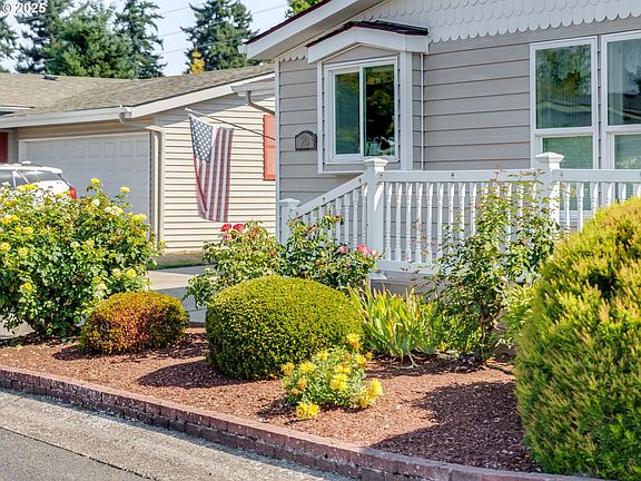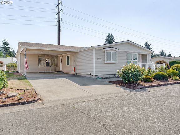 Welcome home! Meticulously maintained and clearly loved, this fabulous residence offers all the warmth and comfort of a traditional home, while maintaining community within a manufactured home park of 55+ residents. Situated on a desirable corner lot, the home is complemented with abundant parking — from the spacious driveway to the extended carport, plus generous surrounding street access, and nearby RV parking. The carport alone is impressive, and the attached breezeway and expansive storage areas rival what you'd find in most full-sized garages. The carport ceiling is finished to provide more than enough space in the gable, for more storage needs. Step inside the home to see the thoughtful upgrades and tasteful design. The roof was replaced in 2023, and in 2024, the kitchen was beautifully remodeled — featuring new flooring, countertops, upgraded appliances, a charming custom pantry door, and an abundance of custom cabinetry. The main living area includes wall-to-wall carpeting, large closets, and windows adorned with top-down/bottom-up blinds — some even with blackout shades for optimal privacy. Bathrooms have been upgraded with ADA-height elongated toilets and elevated vanities for ease of use. The primary bedroom, with it's extra large closet, is a true retreat, offering an en-suite experience complete with a walk-in shower, tile flooring, and ample storage. In addition, a shared-access bathroom, between the living area and utility room adds convenience for visitors. The utility room is another standout — complete with a deep sink, built-in storage, room for an upright freezer, and an additional separate storage room. You’ll also love the insulated, energy-efficient vinyl siding, and low-maintenance Trex porches with stylish vinyl railings. The interior offers a smart layout with comfort in mind. Set in a quiet, well-kept neighborhood, this home is move-in ready and tastefully decorated throughout with a pride of ownership design, to feel like home.