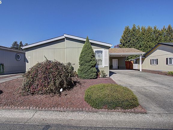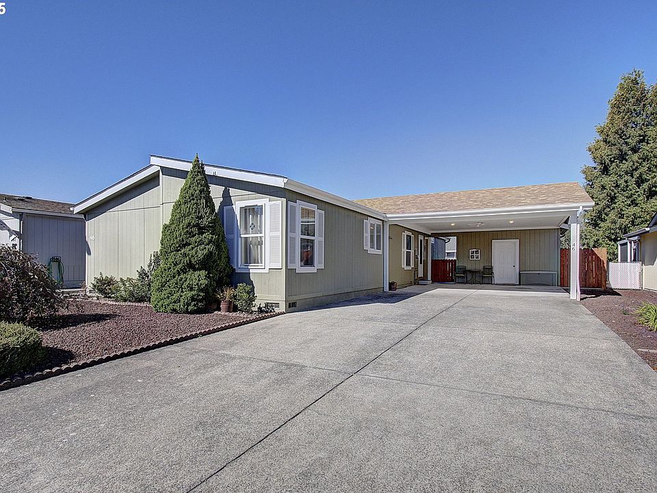 Immaculate open, vaulted plan with cozy fireplace and skylights in family room, island kitchen, pantry, real wood kitchen cabs, newer roof and HVAC. Bedrooms are huge and separated-could be 2 masters-soaking tub and big shower. Fenced yard, big carport and storage shed. 55+ park. ****Must be park approved BEFORE offer will be accepted*****