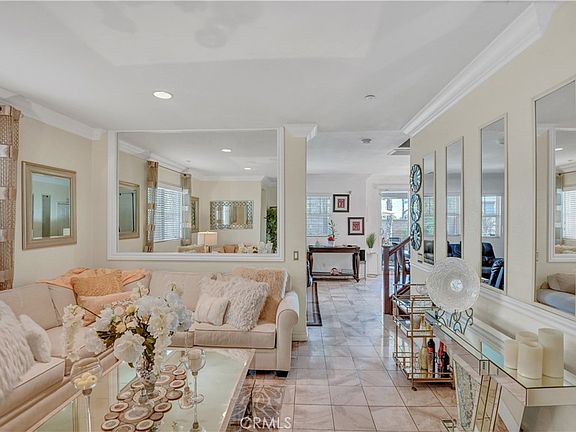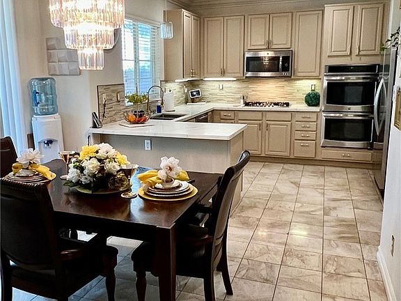 The kitchen, truly the heart of the home, has been beautifully renovated with sleek countertops featuring striking white and gold hues. Custom crown molding and exquisite tile floors flow seamlessly throughout, adding a touch of sophistication that elevates every space.