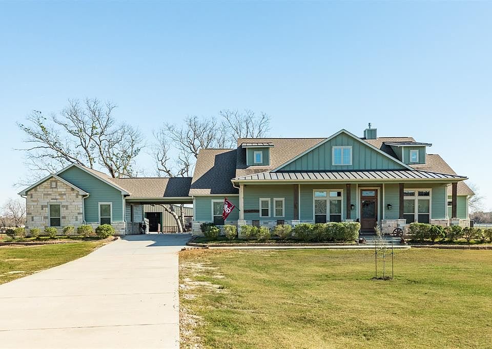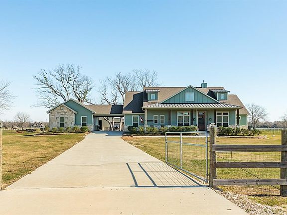 Beautiful custom home with shop/barn on 5 acres in Suncreek Ranch. The home was completed in April 2017, and has so much to offer. This 1-1/2 story has all bedrooms downstairs with Media Room and extra space upstairs. The open floor plan is perfect for entertaining family and friends. Large Entry and Office in the front of the home. Kitchen has lots of cabinet storage with over sized island/breakfast bar and walk in pantry. Self closing cabinetry and draws throughout home. Master bedroom has its own fireplace. Master bath comes with large his and her walk-in closets with custom walk through shower. This home has many upgrades including, custom build-in, custom doors, wood beams in ceiling of living room and kitchen, over sized 6 burner with griddle double oven gas range, covered patio and so much more. 60X40 Metal shop/barn is on concrete slab with electricity and has covered stall on each side. This incredible home is a must see. Home did not flood in Harvey.