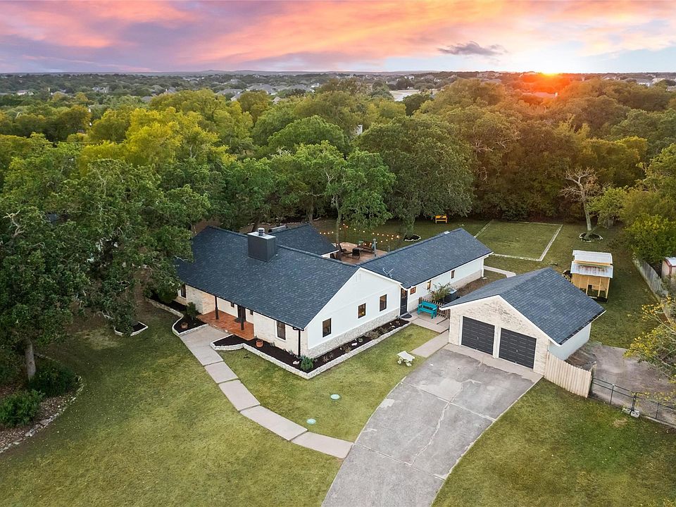 Single-story stone ranch-style home tucked away on a private 1-acre lot in the highly desirable Goldenwood West community. Acre homesites surrounded by mature trees are rare—and this property combines that tranquil Hill Country feel with thoughtful modern updates. The exterior has been freshly painted and now features brand-new lighting, a new roof, and a new AC unit. A long driveway leads to a detached 2-car garage plus an additional detached 2-car garage with a covered carport—perfect for storing an RV, camper, or boat, or converting into a workshop, man cave, or hobby space. Inside, soaring vaulted wood ceilings and rich wood floors set a warm, inviting tone. A stacked stone fireplace anchors the living room, while a wall of sliding glass doors brings the outdoors in and extends the living space to a large back deck and patio. The granite kitchen offers ample cabinetry, a center island, and a breakfast area with plenty of room to gather. A dedicated study provides a quiet retreat for work or school, while the flexible floorplan includes a primary suite with wood ceiling accents, patio access, dual vanities, and a walk-in shower. Two secondary bedrooms round out the home, including one with a private bonus space—ideal for an office, sitting room, or playroom. Enjoy multiple outdoor living areas with both covered and uncovered patios and a tree-shaded backyard that feels like your own retreat. The property has the perfect spot for a pool or even pickleball courts—a true oasis waiting to be created. Goldenwood West residents enjoy a welcoming community with a pool, tennis courts, and playgrounds. You’ll love the peaceful Hill Country setting just minutes from Austin, with the new HEB at Nutty Brown, Belterra Village, and acclaimed DSISD schools—Cypress Springs Elementary, Sycamore Springs Middle School, and Dripping Springs High School—all nearby. This property offers the perfect balance of privacy, space, and convenience—ready for you to make it your own.