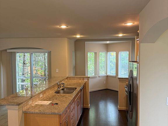Downstairs offers living room with slider to small patio which backs up to a natural area, kitchen and kitchen nook with nice windows great space for a kitchen table