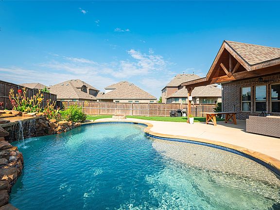 Wait until you see this STUNNING backyard oasis with a sparkling pool and waterfall! Spacious covered back patio perfect for entertaining. Separate fenced area with turf just perfect for a dog run! Access this area by sliding doors, which also allow extra natural light in the kitchen. Enjoy your gorgeous kitchen with sleep quartz counters and bright white cabinets. Living room overlooks the backyard and has a decorative wall with shiplap. Updates include luxury vinyl wood plank floor throughout the ENTIRE home. This home is also located walking distance to a community park. Community boasts two pools, playgrounds, exercise gym, parks and walking trails. Enjoy Prosper ISD schools especially the NEW RICHLAND HIGH SCHOOL. Easy access to the DNT and the Gates of Prosper shopping and restaurants.