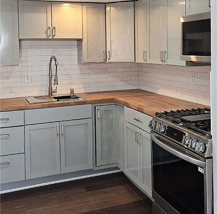 Step inside to discover a bright, comfortable living space with gorgeous hardwood-style flooring on the first floor crafted from durable vinyl with a natural wood top layer for both beauty and practicality. The stunning kitchen is a true highlight, offering solid wood countertops, soft-closing wood cabinets, and top-of-the-line SMART appliances. With ample counter space and storage, it's perfect for both cooking and entertaining.