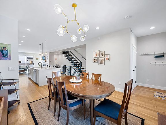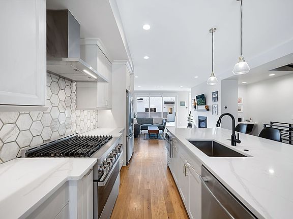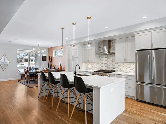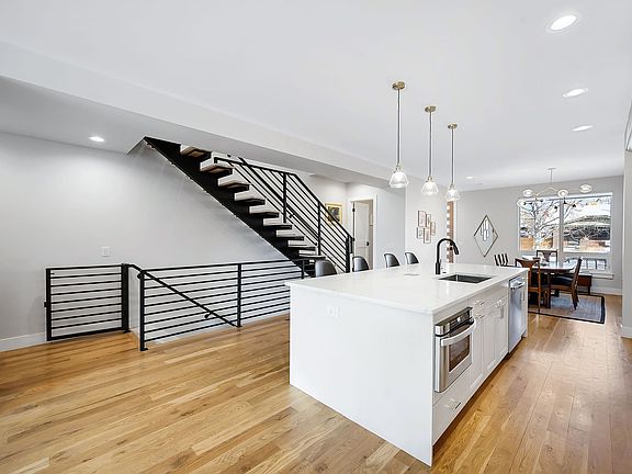 Modern TK Morrison built half-duplex just one block from City Park, featuring a finished basement, fenced back yard, and insulated 2-car garage with custom rock climbing wall and level 2 EV charger. The main floor boasts a modern open layout with quartz counters and premium JennAir appliances in the kitchen, a living room with gas fireplace and triple slider patio door, a built in desk area, and a powder room. The primary suite, primary bathroom, and an additional full bathroom, bedroom, and guest room with covered balcony, are on the 2nd level. The finished basement has a bonus living room with wet bar, a 4th bedroom, and a full bathroom.