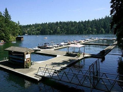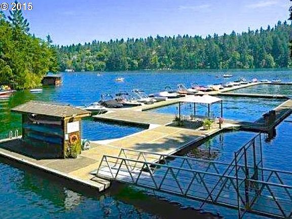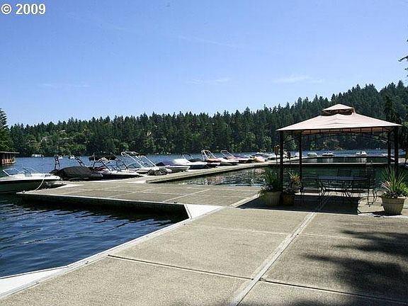 Village on the Lake 3-story home in Lake Oswego with incredible 3 level Timber-Tech deck and wooded view. 4 bdrms,3.5 newly renovated baths, new carpet and paint through-out. Peaceful setting with low maint. landscaping. 2 family rms and a large bonus room. Great separate bdrm & bath for caretaker or nanny. Updated kit. with SS appl, island and walk-in pantry.One of best easements on the lake: http://www.lakecorp.com/easement.aspx?id=19