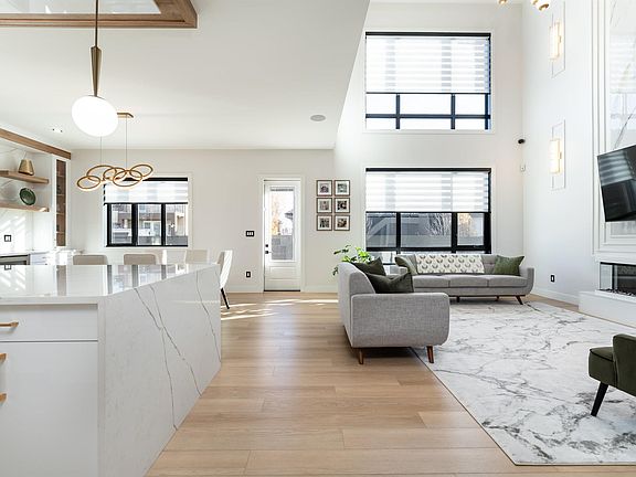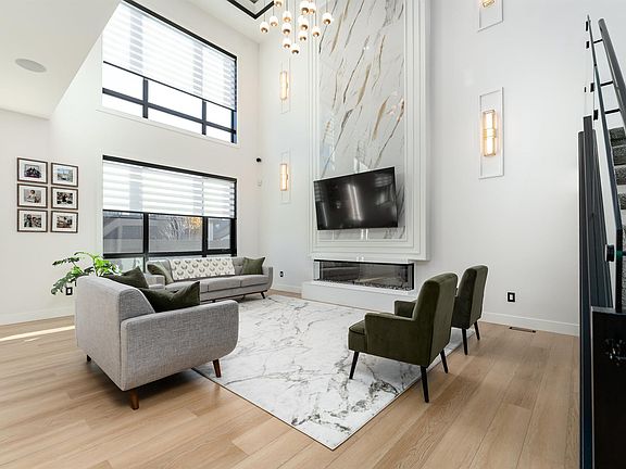 This 4,750 sq ft luxury home combines contemporary design, impeccable finishes, and bold character. Soaring ceilings, natural light, and an open-to-below living room create a grand impression, highlighted by a granite feature wall and a fireplace. The main floor includes a dining area and high-end kitchen with high-gloss cabinetry, warm wood accents, double wall ovens, and a large island, plus a spice kitchen with quartz counters, matching cabinetry, an oven, and wet bar. A private office and full bathroom complete the main level. Upstairs offers 3 bedrooms with walk-in closets, including a stunning primary suite with double sinks, soaker tub, and standing shower, as well as a family room and laundry room with wet bar. The basement features a SEPARATE entrance, a wet bar, large rec area, and a 4th bedroom with walk-in closet and bathroom access — offering excellent potential to develop into a legal suite, or an ideal private guest suite. Located near the Quarry Golf Course and scenic river valley trails.