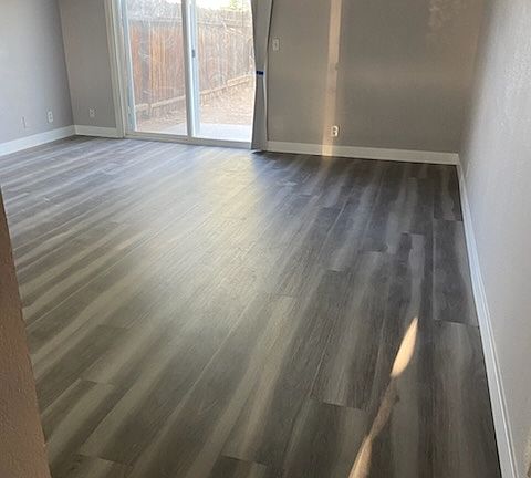 new paint, new vinyl flank floor, own patio back yard, laundry hook up in 2 car garage
