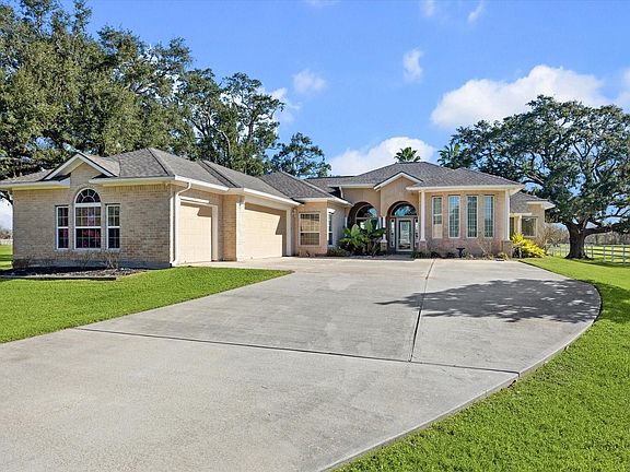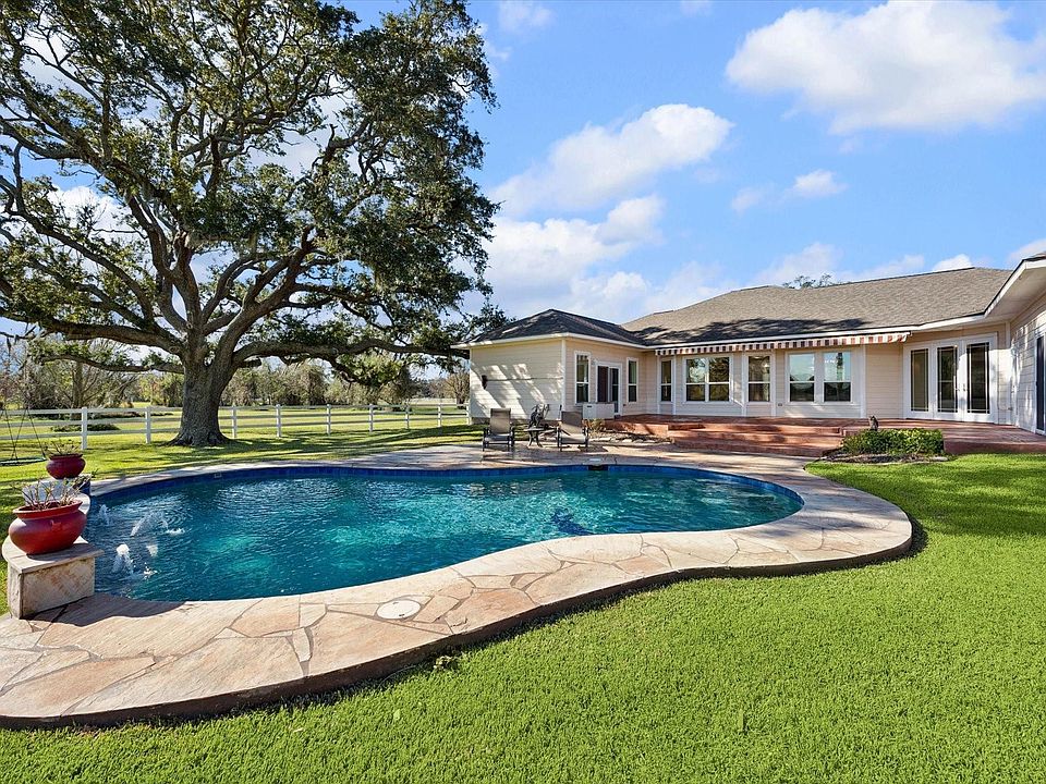 This one will be love at first sight! Come see!! The custom-like details of this home show as soon as you walk through the front door...Stunning floorplan with beautiful wood flooring & high ceilings upon entry, showcased by a wall of windows overlooking the pool area, back deck and acreage...The Primary Bedroom is a must see to appreciate & is basically the whole right wing of the floorplan, featuring a very large bedroom area, two closets (one is huge), double sinks, corner jetted tub w/ separate shower...Multiple exits lead from the back to the pool deck (800 square feet), which is covered by a motorized retractable awning...Bedroom 3 is designed like a guest suite, perfect for friends & family to visit...Bedroom 2 is similar...The Kitchen is Awesome!...Center Island, Breakfast Bar, everything you want...This fantastic home also boasts electrical surge protection, 3-car oversized garage, recent roof and water softener, all situated on 5 acres for you to enjoy!... HOME DID NOT FLOOD!