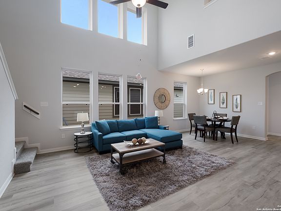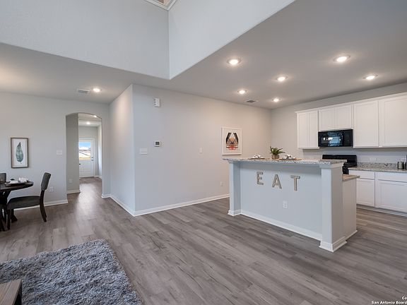 Newly constructed and move in ready! Bright, airy floor plan with SOARING ceilings and plenty of natural light! Luxury vinyl plank flooring for easy maintenance! Entertainer's kitchen w/ GAS cooking, walk-in pantry, granite & TONS of cabinet space! Downstairs primary suite w/ private bath featuring dual vanities, garden tub & walk-in shower AND a huge walk-in closet! Secondary bedroom down w/ full bath! Large backyard w/ a Texas sized covered patio that is ready for the next BBQ! Upstairs features a HUGE game room, two secondary bedrooms and a full bath! Located a short 20 minutes from downtown San Antonio, Hickory Ridge is Elmendorf's newest subdivision featuring a resort style amenity center with a pool, a lazy river, park/playground and clubhouse! Absolutely a MUST SEE!