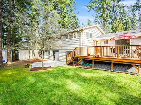 Nice home, good location, quiet street. Spacious entrance, lovely light living room w/slider to the front deck. Beautiful newly refinished hardwood floors throughout main level. Heat pump-heat & A/C. Kitchen w/eating nook, bar, & newer cabinets w/marble backsplash. Generous dining rm w/ wood stove. Spacious deck. Upstairs...3 bedrooms & updated bath. Downstairs- family room w/fireplace, office(or 4th bed) w/3/4 bath. Slider to patio & yard. Carport w/new roof & storage. Yard, sheds & playhouse.