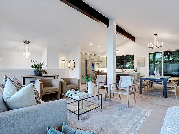 Fully renovated home features vaulted ceilings with exposed beams & wide plank hardwood floors. Enjoy indoor/outdoor entertaining in your welcoming kitchen overlooking the private greenspace w/patio, then enjoy the outdoors on your oversized deck. Floor to ceiling windows showcase mountain views to be enjoyed while relaxing in your oversized living room. Primary suite offers his/hers closets plus an invigorating spa bath with floating double vanity. Lower level provides potential for separate living quarters with it's own entry, bedroom with 3rd bath, walk-in closet, spacious family room, kitchenette & 2nd fireplace. Energy efficient A/C included. Wired for electric car charger. Walkable to MSFT and Marymoor Park. ONE YEAR HOME WARRANTY!