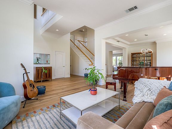 -Entry living room with guitar, grand piano, swivel chairs, and sofa