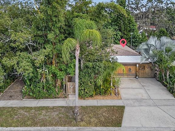 Step into this truly one-of-a-kind 2-bedroom, 1-bath home blends character, comfort, and tropical charm! From the moment you arrive, you’ll fall in love with the lush tropical landscaping and unique curb appeal that make this home stand out. Enjoy mornings or evenings on the oversized screened-in porch, with walkable corrugated ceiling and custom wood details is a true standout and includes a custom-built table that perfectly compliments the natural wood beams and outdoor setting. Inside, you’ll find a spacious layout that includes, a family room complete with a fireplace, perfect for relaxing or staying warm on chilly nights. Stonework accents inside the kitchen, doorways and window add to its unique appeal. The eat-in kitchen area has built in tiled shelves with room for a small table and chairs. For a larger gathering, enter the separate formal dining room that is spacious for shelving or table and chairs. Through the french doors you'll enter the Bonus Game HVAC-Room, complete with a pool table that converts into a card table for endless fun and relaxation. There's ample off street parking (gravel and concrete) for guests when you’re hosting gatherings. Recent updates include a 2023 roof and HVAC and two storm-rated sliding doors. This home blends Florida living with artistic flair, perfect for someone who appreciates character, privacy, and outdoor beauty completed with a backyard fire pit. With its charming details and inviting spaces, this is not your average cookie-cutter home! Replacement of Roof and HVAC were completed in 2023.
