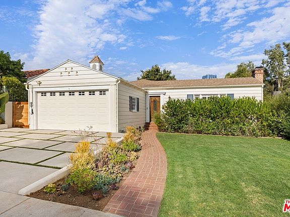 Newly priced! Presenting this delightfully charming refuge, set back from a tree-lined street with a grassy lawn, drought-tolerant landscaping, and privacy hedges. A red brick pathway leads to a traditional front door, inviting visitors within. Inside, the living room's character is marked by beautiful wood floors, a brick fireplace with classic mantel, vaulted ceilings with exposed beams, and plantation shutters. Nearby, the formal dining room adjoins a full wet bar for serving friends, family, and party guests. The adjacent family room completes the entertaining space, with a sliding glass door to the rear yard, affording the quintessential indoor-outdoor lifestyle. The kitchen features an abundance of cabinetry, granite countertops and backsplash, picture window, and eat-in area. Bedrooms are spacious and light-filled, and bathrooms are soothing and pleasant. The primary bath is beautifully preserved with its original azure blue tile work typical of its storied era, with separate tub and shower. Located off of the front bedroom is a fully remodeled secondary bath with vessel sink and contemporary vanity as well as a rainwater shower with niche and bench, adorned with glossy subway and hexagonal mint tiles. Other updates include new water heater and gas line. Outside, a terrace is perfect for dining al-fresco and evening conversation under California skies, all surrounded by mature greenery. Fully enclosed and secure, this backyard is an ideal place for pets and little ones to roam and play. Enjoy the convenience of ample parking with a finished two-car garage plus Tesla charging station in the three-car driveway. Newly installed ADT alarm system includes motion sensors and wiring on all doors. This well-positioned home is just moments to Century City, UCLA, Westwood Village, freeways, Beverly Hills, schools, parks, and all the Westside offers. Welcome!